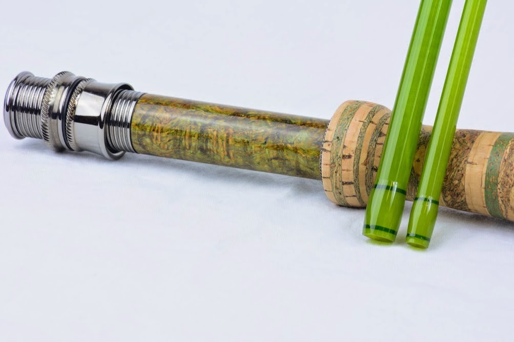 Holland wrote... "This build features clear wraps and black ash burl dyed green for the handle. On this handle I wanted to go a little nuts with the cork saw and the handle has over forty rings cut in six different thicknesses. I used two different greens to match the rod and reel seat."