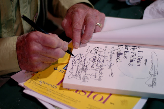 Here's a trip down memory lane to a couple past T.F.M. posts where I chronicled Dave Whitlock signing a fellow's book complete with a bass sketch (the guy was absolutely blown away and trembling afterwards) and then the few minutes that I had with him while he autographed the carp and smallmouth print that is framed in my office now.